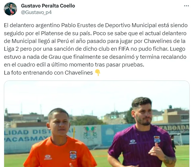 “El delantero argentino Pablo Erustes de Deportivo Municipal está siendo seguido por el Platense de su país. Poco se sabe que el actual delantero de Municipal llegó al Perú el año pasado para jugar por Chavelines de la Liga 2, pero por una sanción de dicho club en FIFA no pudo fichar. Luego estuvo a nada de Grau, que finalmente se desanimó y terminó recalando en el cuadro edil a último momento tras pasar pruebas”, escribió el comunicador en su twitter oficial.