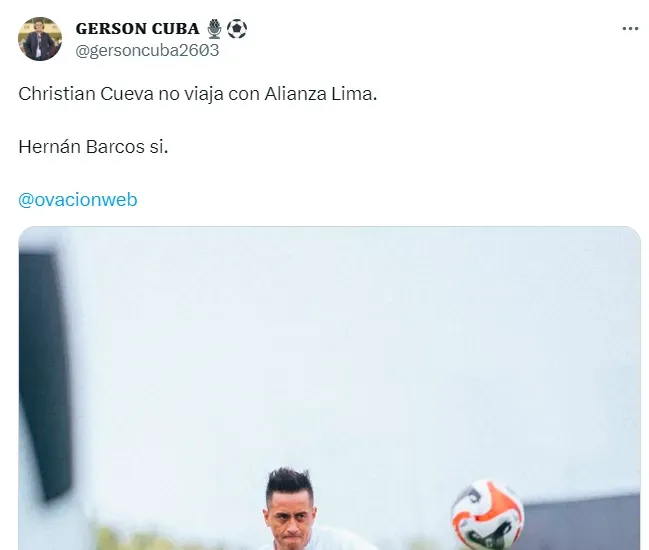 “Christian Cueva no viaja con Alianza Lima. Hernán Barcos sí”, escribió el comunicador a través de su cuenta oficial de Twitter.
