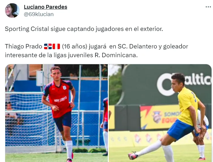 “Sporting Cristal sigue captando jugadores en el exterior. Thiago Prado (16 años) jugará en SC. Delantero y goleador interesante de la ligas juveniles R. Dominicana”, escribió el comunicador en su cuenta de Twitter.