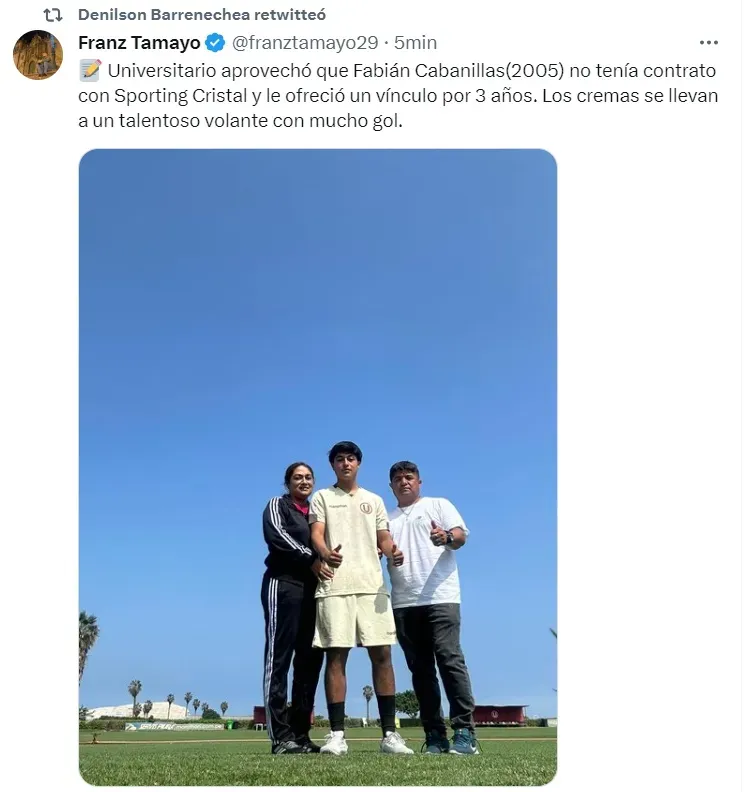 “Universitario aprovechó que Fabián Cabanillas (2005) no tenía contrato con Sporting Cristal y le ofreció un vínculo por 3 años”, se lee en la primera parte del mensaje.