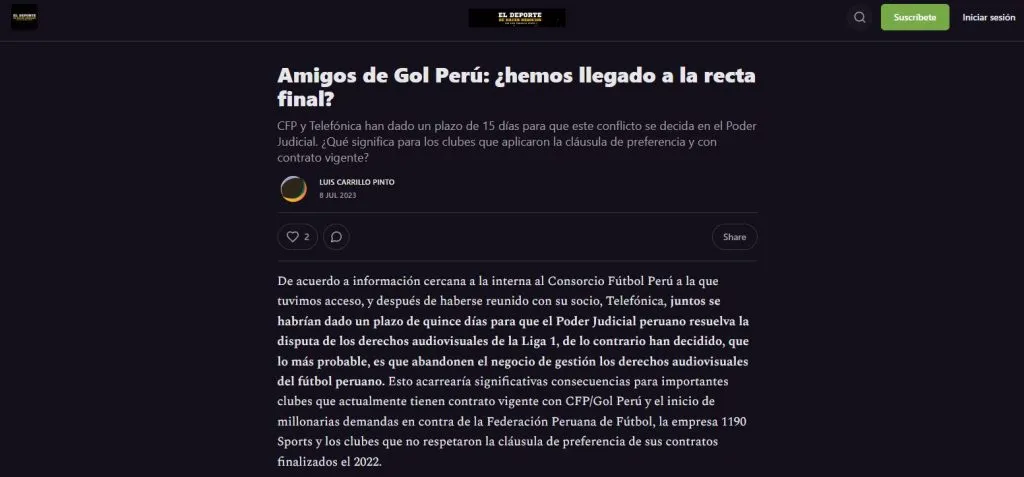 Titula su nota informativa así: Amigos de Gol Perú: ¿hemos llegado a la recta final? Para después dar paso a puntos especiales: “De acuerdo a información cercana a la interna al Consorcio Fútbol Perú a la que tuvimos acceso, y después de haberse reunido con su socio, Telefónica, juntos se habrían dado un plazo de quince días para que el Poder Judicial peruano resuelva la disputa de los derechos audiovisuales de la Liga 1. De lo contrario, han decidido, que lo más probable, es que abandonen el negocio de gestión los derechos audiovisuales del fútbol peruano”.