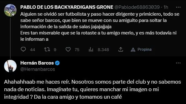 PABLO DE LOS BACKYARDIGANS GRONE. Por su opinión con información, pero también algo de enojo: “Alguien se olvidó ser futbolista y pasó a ser dirigente y primiciero, todo se sabe señor barcos, que bien se mueve con su amiguito para soltar la información de la salida de salas jajajajaja. Eres tan miserable que se la rotaste a tu amigo Merlo, y es más, todavía ni le informaba a él”.