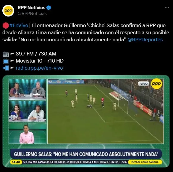 Mediante un despacho, el periodista de RPP Noticias soltó un poderoso dato: “El entrenador Guillermo ‘Chicho’ Salas confirmó a RPP que desde Alianza Lima nadie se ha comunicado con él respecto a su posible salida: “No me han comunicado absolutamente nada””.