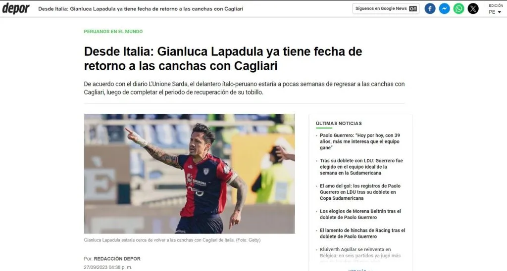 También comenta el medio periodístico peruano, lo que serán sus siguientes pasos: “Eso sí, todo dependerá del comando técnico y la evaluación que realice el departamento médico del club; de estar todo en orden, ‘Lapagol’ estaría presente en el duelo que tendrá Cagliari de visita frente a Salernitana, el próximo 22 de octubre”.