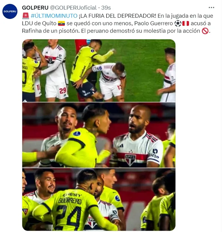Paolo Guerrero es titular en el cotejo entre Liga de Quito ante Sao Paulo. Chocando por la vuelta de los cuartos de final de la Copa Sudamericana, el delantero peruano tuvo un momento caliente luego que Rafinha lo pisara. Subiendo la tensión de todo el Morumbí, el ariete se descontroló visiblemente enojado.