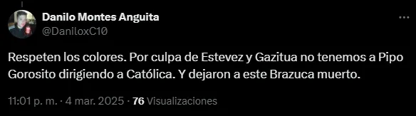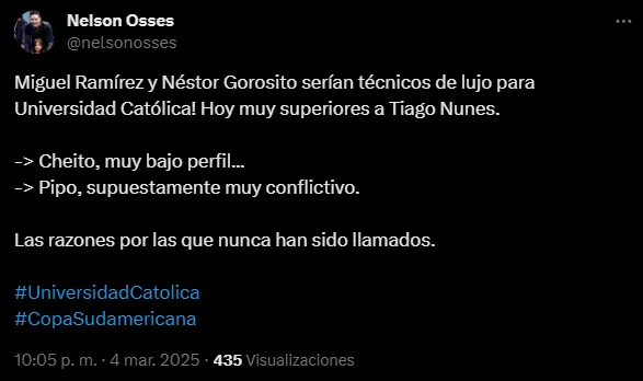 Y el nombre que ha sonado en las redes sociales de los hinchas de Universidad Católica es el de Pipo Gorosito. Los fanáticos no entienden cómo no se le ha dado una oportunidad a un campeón en el club como jugador. Su buen momento en Perú también ha propiciado este pedido.