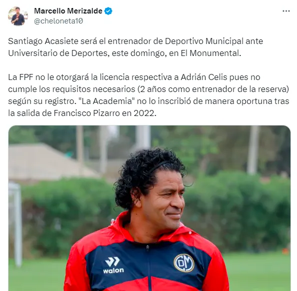 “Santiago Acasiete será el entrenador de Deportivo Municipal ante Universitario de Deportes, este domingo, en El Monumental. La FPF no le otorgará la licencia respectiva a Adrián Celis, pues no cumple los requisitos necesarios (2 años como entrenador de la reserva) según su registro. La Academia no lo inscribió de manera oportuna tras la salida de Francisco Pizarro en 2022”, escribió el comunicador en su cuenta oficial de X (antes llamado Twitter).
