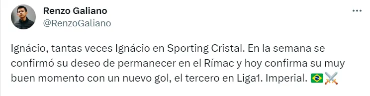 “Ignácio, tantas veces Ignácio en Sporting Cristal. En la semana se confirmó su deseo de permanecer en el Rímac y hoy confirma su muy buen momento con un nuevo gol, el tercero en Liga 1. Imperial”, indicó el comunicador en su cuenta oficial de Twitter.