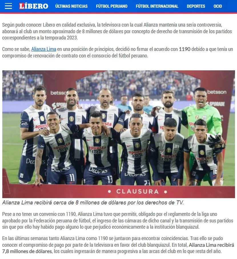 ¿CUÁNTO PAGARÁ 1190 SPORTS A ALIANZA LIMA?