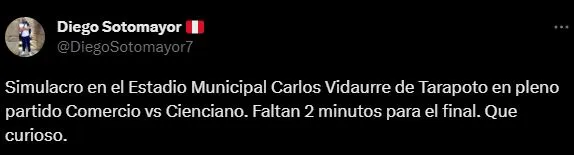 Nos la explica el periodista Diego Sotomayor del Diario Líbero: “Simulacro en el Estadio Municipal Carlos Vidaurre de Tarapoto en pleno partido Comercio vs. Cienciano. Faltan 2 minutos para el final. Qué curioso”. Causando extrañeza en los usuarios de las redes sociales.