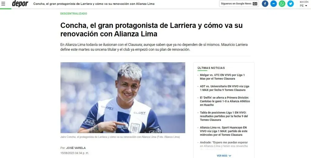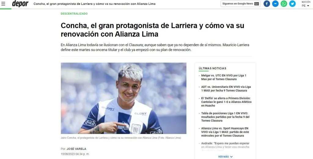 Lo cuenta el periodista José Varela, con un contexto perfecto: “Jairo Concha es el futbolista de quien hablan todos en Alianza Lima. No solo por su crecimiento futbolístico precedido del gol, sino también porque a falta de pocos meses para que culmine la Liga 1 sigue sin ampliar el contrato que lo une a los blanquiazules hasta el fin de este año”.