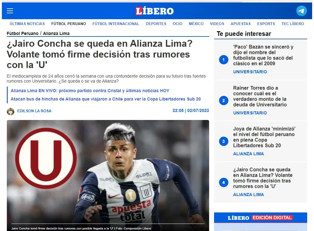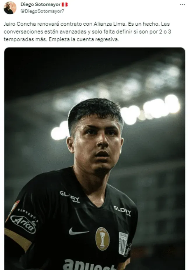 “Jairo Concha renovará contrato con Alianza Lima. Es un hecho. Las conversaciones están avanzadas y solo falta definir si son por 2 o 3 temporadas más. Empieza la cuenta regresiva”. Explicó en su cuenta de Twitter el periodista del Diario Líbero, Diego Sotomayor.