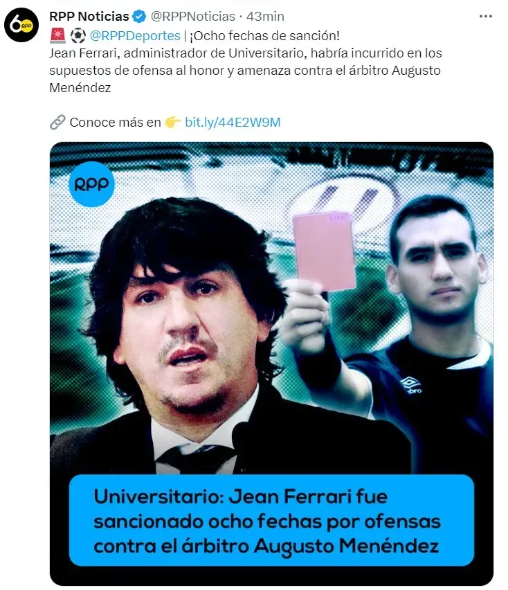 Pero la sanción no solo termina ahí. Afectando a Jean Ferrari, el castigo también va contra Universitario: el cuadro crema tendrá que pagar 2 UITS (aproximadamente diez mil soles).