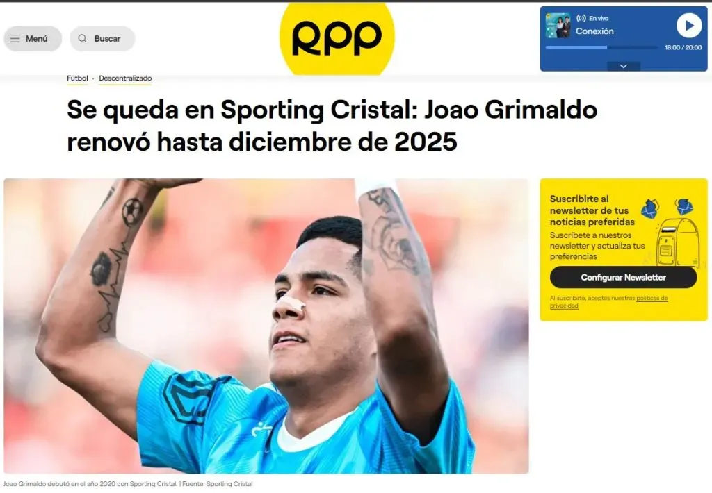 La información fue presentada por el medio radial, que contextualiza, sobre el futuro inmediato del joven delantero: “El tema de la renovación tampoco tuvo muchos inconvenientes a la hora de encontrar el ansiado acuerdo final. Joao Grimaldo se siente a gusto en Sporting Cristal y en La Florida apuestan mucho por su consolidación, así como su posible llamado a la Selección Peruana”.