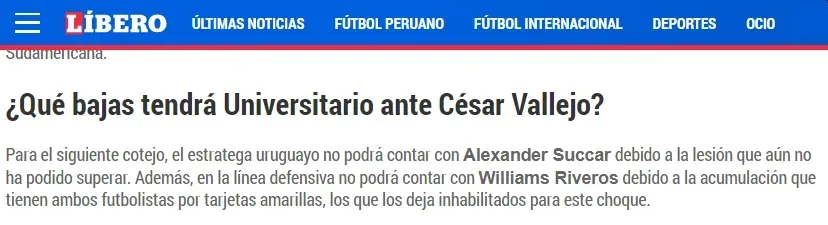 Por otro lado, tampoco estará disponible el defensor Williams Riveros. El zaguero tiene acumulación de amarillas y por esa razón no podrá jugar el cotejo entre Universitario de Deportes ante Universidad César Vallejo.