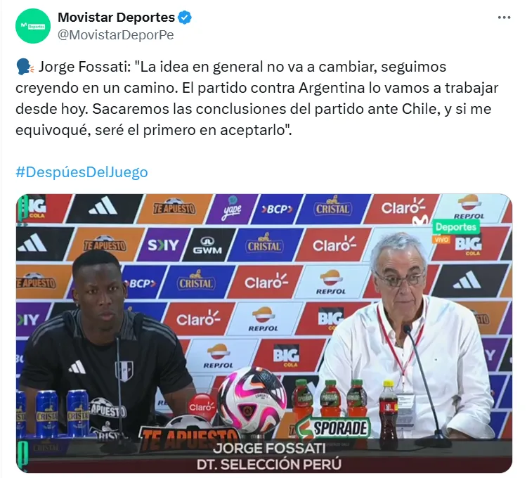 Así pues, en declaraciones que mostró en vivo Movistar Deportes, Jorge Fossati primero analizó cómo se siente tras el empate entre Perú vs. Chile: “Hay menos margen de error, por lo cual analizando el partido desde el resultado, no quedamos satisfecho para nada porque queríamos darle alegrías al hincha, que sin ningún tipo de dudas se lo merece”.