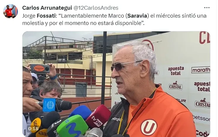 “Lamentablemente Marco Saravia el miércoles sintió una molestia y por el momento no estará disponible”, precisó Jorge Fossati.