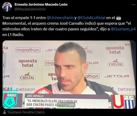 Por ese lado seguramente pasó la calentura de José Carvallo después del partido, donde tomó el micrófono como referente absoluto. Para poder darle una crítica al juego de Alianza Lima por el trámite general. Al final, podría tomarse como un aspecto más general, ya que el resultado se analizaría como más beneficioso para la tienda crema.