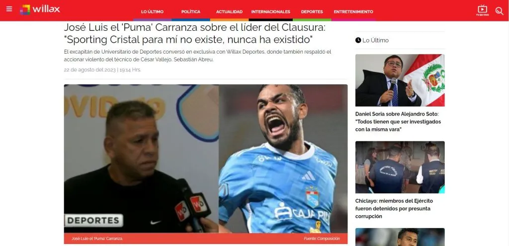 Fiel a su estilo, El Puma Carranza salió con la pierna en alto en Willax Deportes. Para criticar el manejo de los rimenses en el actual campeonato, después del partido contra Deportivo Municipal: “Cristal para mí no existe, nunca ha existido. Siempre lo he dicho. El VAR no existe para algunos”.