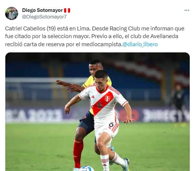 “Catriel Cabellos (19) está en Lima. Desde Racing Club me informan que fue citado por la selección mayor. Previo a ello, el club de Avellaneda recibió una carta de reserva por el mediocampista”, escribió.