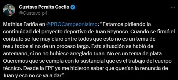 Mathias Fariña, representante y abogado de Juan Reynoso, tuvo diálogo con PBO Campeonísimo. Sus palabras no caerán nada bien en el pueblo deportivo: “Hemos tenido diálogos en las últimas horas. Si la pregunta en particular es que en algún momento se comunicó la intención de despedirlo a Juan, no nos han comunicado de parte de Federación de esta intención. Estamos conversando sobre la continuidad”.