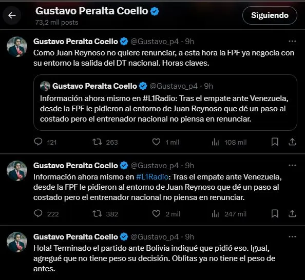 Minutos después le añadió a su relato: “Tras el empate ante Venezuela, desde la FPF le pidieron al entorno de Juan Reynoso que dé un paso al costado, pero el entrenador nacional no piensa en renunciar”. Dejando en claro que lo que vendría desde ese instante, en adelante, iba a ser solamente responsabilidad del directorio de la Federación Peruana de Fútbol.
