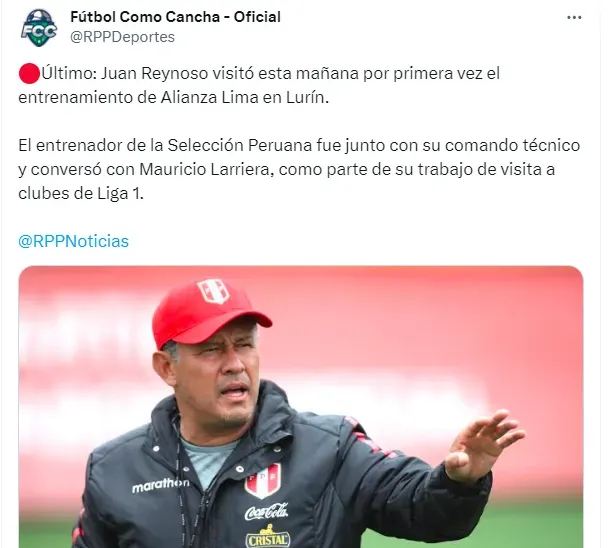 “Juan Reynoso visitó esta mañana por primera vez el entrenamiento de Alianza Lima en Lurín. El entrenador de la Selección Peruana fue junto con su comando técnico y conversó con Mauricio Larriera, como parte de su trabajo de visita a clubes de Liga 1”, informaron en su cuenta oficial de X (Twitter).