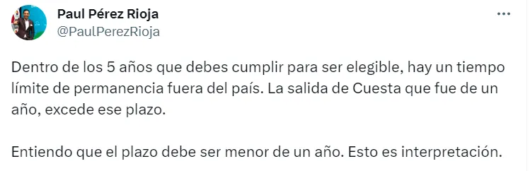 “Entiendo que el límite es menor a ello. Recién en el 2026 es elegible. Dentro de los 5 años que debes cumplir para ser elegible, hay un tiempo límite de permanencia fuera del país. La salida de Cuesta que fue de un año, excede ese plazo. Entiendo que el plazo debe ser menor de un año. Esto es interpretación”, añadió el hombre de prensa.