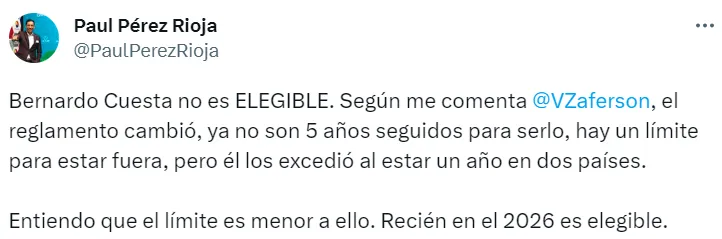 “Bernardo Cuesta no es ELEGIBLE. Según me comenta Víctor Zaferson, el reglamento cambió, ya no son 5 años seguidos para serlo, hay un límite para estar fuera, pero él los excedió al estar un año en dos países, escribió el comunicador en su cuenta de Twitter.