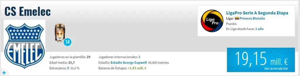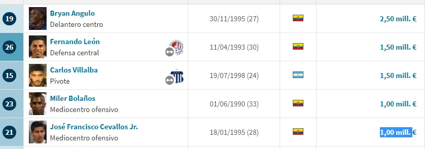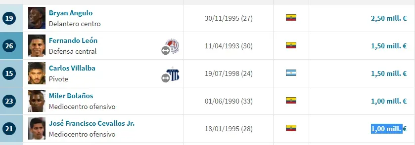 Y sus mejores intérpretes son: 1) Bryan Angulo 2,50 millones, 2) Fernando León 1,50 millones, 3) Carlos Villalba 1,50 millones, 4) Miler Bolaños 1,00 millones y 5) José Francisco Cevallos Jr. 1,00 millones. ¿Esto pesará a la hora del duelo? Veremos cómo va ese tema.