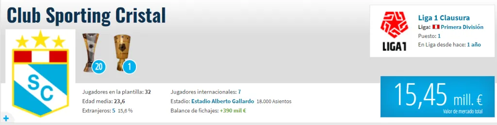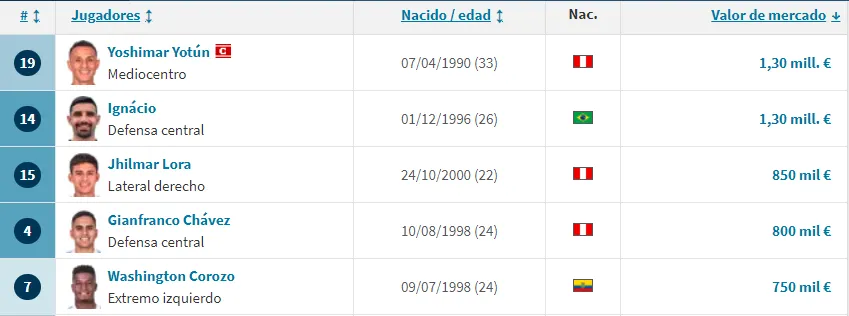 Sus jugadores más valiosos son: 1) Yoshimar Yotún 1,30 millones, 2) Ignácio Da Silva 1,30 millones, 3) Jhilmar Lora 850 mil, 4) Gianfranco Chávez 800 mil y 5) Washington Corozo 750 mil.