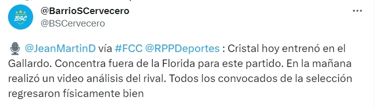 Muy contraria la situación en Sporting Cristal, el periodista Jean Martín Dueñas informó que todos en el cuadro del Rímac están aptos y a disposición: “Concentran fuera de La Florida para este partido y en la mañana realizó un video análisis del rival. Todos los convocados de Perú regresaron físicamente bien”.