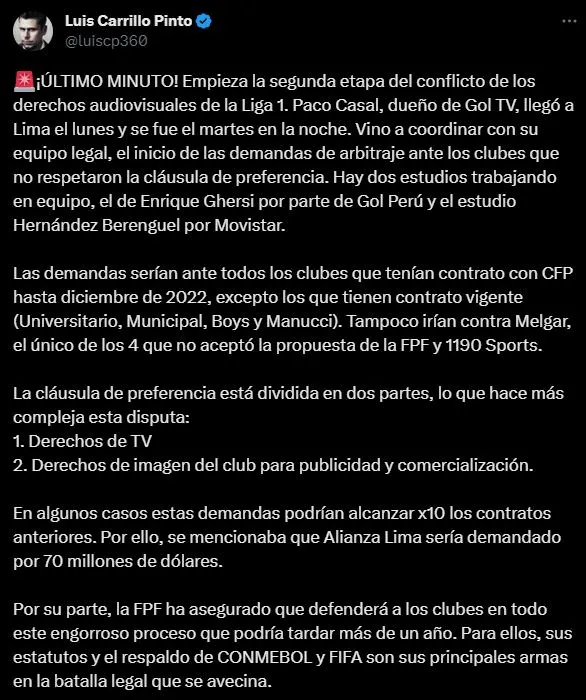 El popular periodista, especializado en estos asuntos, abre así su intervención: “¡ÚLTIMO MINUTO! Empieza la segunda etapa del conflicto de los derechos audiovisuales de la Liga 1. Paco Casal, dueño de Gol TV, llegó a Lima el lunes y se fue el martes en la noche. Vino a coordinar con su equipo legal, el inicio de las demandas de arbitraje ante los clubes que no respetaron la cláusula de preferencia. Hay dos estudios trabajando en equipo, el de Enrique Ghersi por parte de Gol Perú y el estudio Hernández Berenguel por Movistar”.