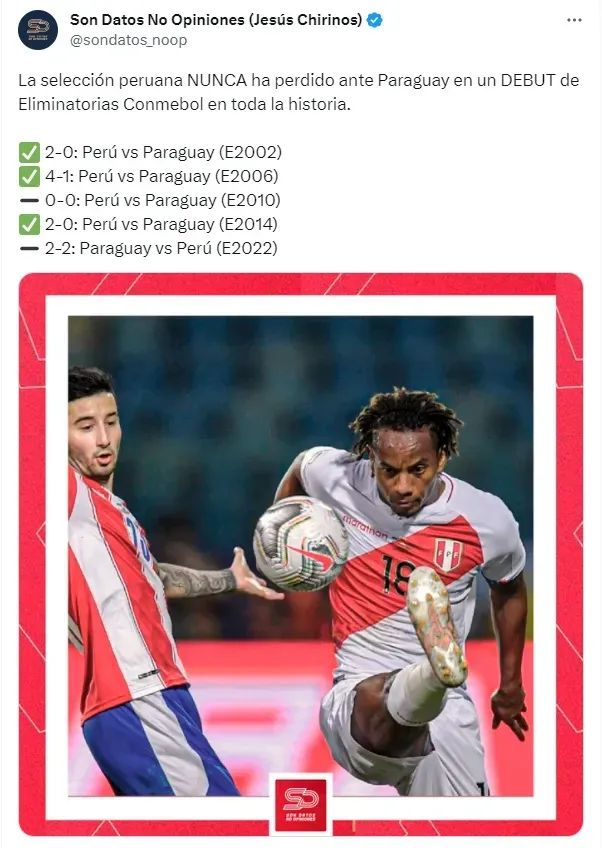 Basándonos en el historial de ambas selecciones en las Eliminatorias Sudamericanas, no existe ningún antecedente de la derrota de Perú ante Paraguay por la fecha 1 del torneo, así lo explicó la cuenta de Twitter de Son Datos no Opiniones.