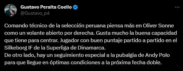 Ahora, como principal noticia, está la información de Gustavo Peralta: “Comando técnico de la selección peruana piensa más en Oliver Sonne como un volante abierto por derecha. Gusta mucho la buena capacidad que tiene para centrar. Jugador con buen puntaje partido a partido en el Silkeborg IF de la Superliga de Dinamarca.
