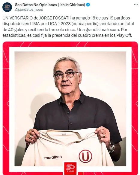 “UNIVERSITARIO de JORGE FOSSATI ha ganado 16 de sus 19 partidos disputados en LIMA por LIGA 1 2023 (nunca perdió); anotando un total de 40 goles y recibiendo tan solo cinco. Es una estadística asombrosa. Según las estadísticas, es casi seguro que el cuadro crema estará presente en los Play Off”, publicó el medio deportivo en su cuenta oficial de X.