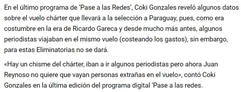 “Hay un chisme del chárter, iban a ir algunos periodistas pero ahora Juan Reynoso no quiere que vayan personas extrañas en el vuelo”, reveló Coki Gonzales.