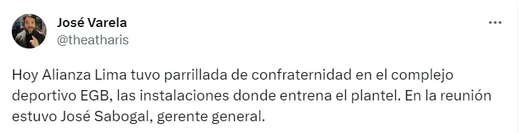 “Hoy Alianza Lima tuvo parrillada de confraternidad en el complejo deportivo EGB, las instalaciones donde entrena el plantel”, comentó José Valera.