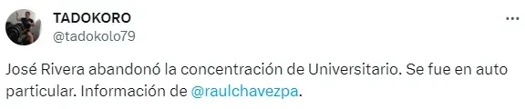 “José Rivera abandonó la concentración de Universitario. Se fue en auto particular. Información de Raúl Chávez”, compartió el comunicador en su cuenta oficial de X (antes llamado Twitter).