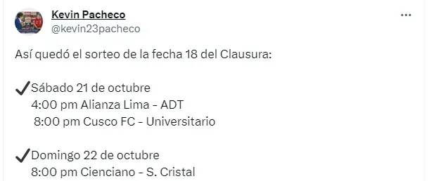 El periodista Kevin Pacheco compartió la programación de estos partidos en su cuenta de X (anteriormente conocida como Twitter): “Así quedó el sorteo de la fecha 18 del Clausura: Sábado 21 de octubre 4:00 pm Alianza Lima – ADT y 8:00 pm Cusco FC – Universitario. Domingo 6 de octubre 6:30 pm Cienciano – S. Cristal”.