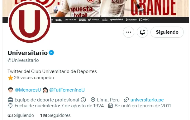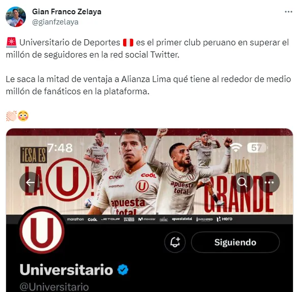“Universitario de Deportes es el primer club peruano en superar el millón de seguidores en la red social Twitter. Le saca la mitad de ventaja a Alianza Lima, qué tiene alrededor de medio millón de fanáticos en la plataforma”, escribió el periodista deportivo Gian Franco Zelaya en cuenta oficial de Twitter.