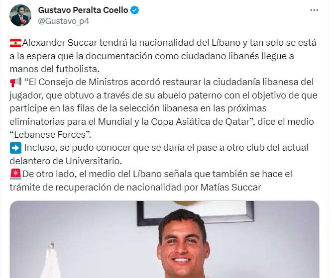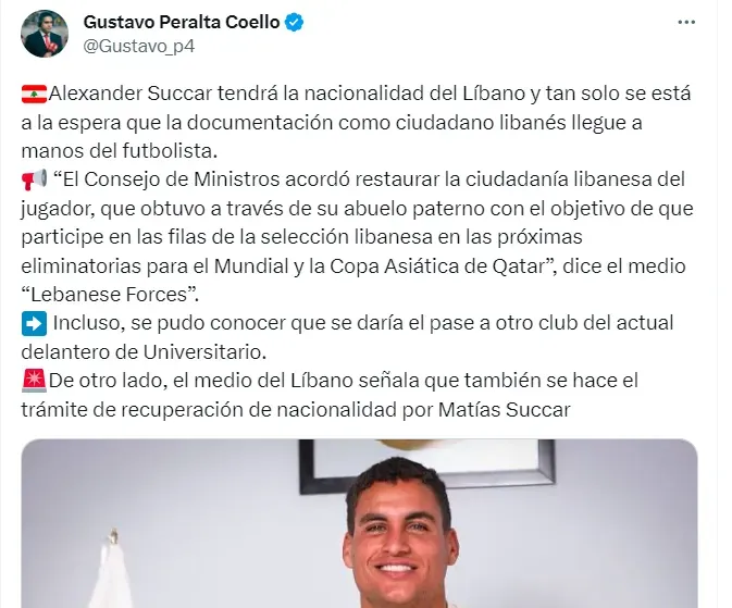 “Alexander Succar tendrá la nacionalidad del Líbano y tan solo se está a la espera que la documentación como ciudadano libanés llegue a manos del futbolista.”, reportó el comunicador en su cuenta oficial de X (anteriormente conocida como Twitter). Esta noticia se fundamenta en una decisión del Consejo de Ministros del Líbano, que restauró la ciudadanía libanesa del jugador, la cual había sido obtenida a través de su abuelo paterno. El objetivo principal de esta adquisición de nacionalidad es permitir que Succar represente a su selección en sus próximos compromisos.