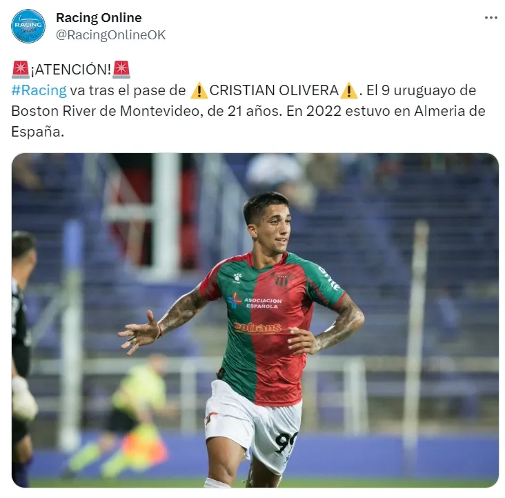 “Racing va tras el pase de Cristian Olivera. El 9 uruguayo de Boston River de Montevideo, de 21 años. En 2022 estuvo en Almería de España”.