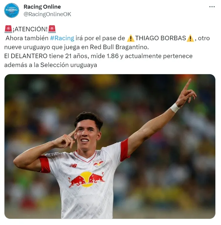 “Ahora también Racing irá por el pase de Thiago Borbas, otro nueve uruguayo que juega en Red Bull Bragantino”.