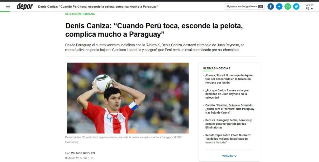 Así arrancó el mítico Denis Caniza en su nota con el periodista Wilmer Robles, para después dar la clave del equipo de Juan Reynoso: “Más me preocupo en el conjunto, todo lo que pueda hacer Perú. Cuando empiezan a tocar el balón, a esconder la pelota, siempre complica a Paraguay. La marcación tiene que ser bien férrea para que eso no ocurra. Paraguay tiene que meter marca férrea y no dejar que toque Perú, no deben tener la posesión del balón”.