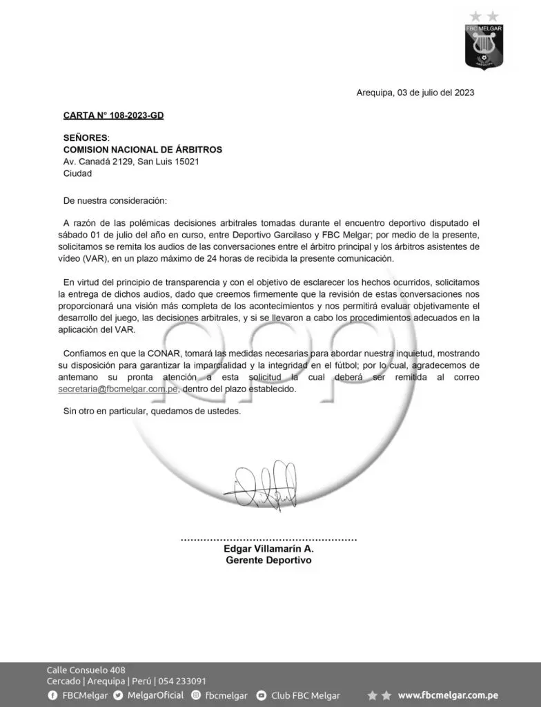 “FBC Melgar es el primer club en solicitar de manera formal a la CONAR los audios de las conversaciones del árbitro Jordi Espinoza con los integrantes del VAR en el partido ante Deportivo Garcilaso”, comentó el comunicador.