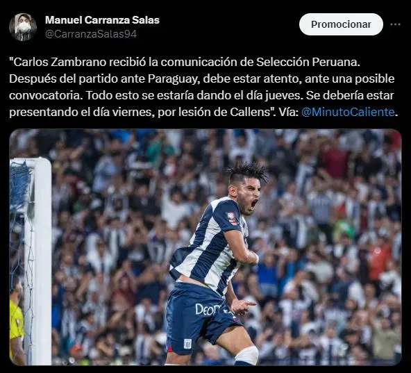 Así lo cuenta el periodista de Minuto TV, Carlos Panez, en la reciente edición del programa deportivo del canal vía internet: “Carlos Zambrano recibió la comunicación de la Selección Peruana. Después del partido ante Paraguay, debe estar atento, ante una posible convocatoria. Todo esto se estaría dando el día jueves. Se debería estar presentando el día viernes, por lesión de Alexander Callens”