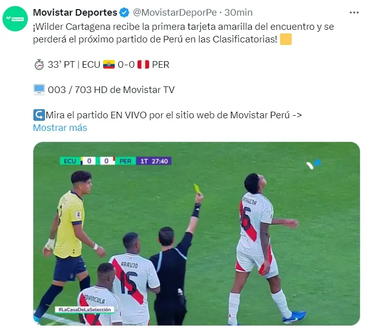 Hay que recordar que la situación se dio en el primer tiempo del duelo entre Perú vs. Ecuador. Jugando por la fecha 8 de las Eliminatorias Sudamericanas, el volante cometió una falta sobre el final del primer tiempo y lamentablemente vio la cartulina amarilla.