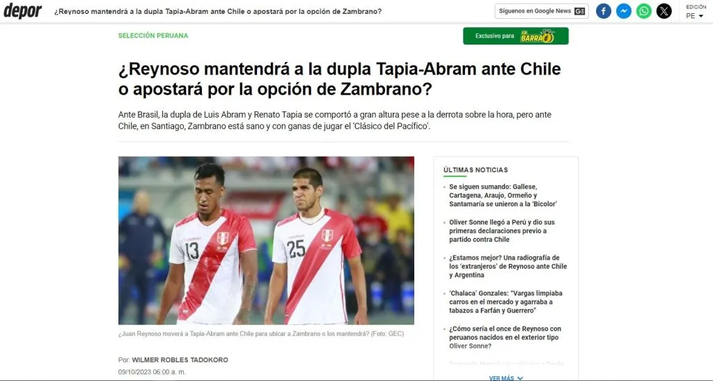 Wilmer Robles, del Diario Depor, expone situaciones reales de la Selección Peruana: “Si bien Perú perdió sobre los noventa minutos con un gol de cabeza de Marquinhos, la dupla de jugadores se batió y respondió antes de la anotación. Sin embargo, para esta nueva fecha doble, el ‘Cabezón’ convocó a Carlos Zambrano, ausente en los partidos iniciales por lesión”.