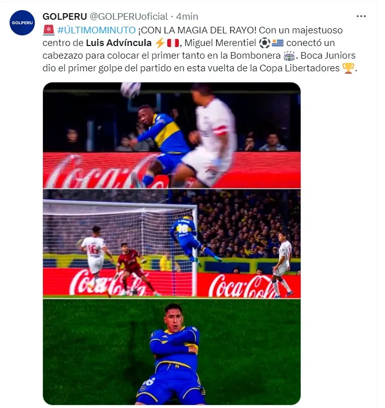 Venciendo así la resistencia del portero de Nacional, el 1-0 a favor de Boca Juniors se concretó gracias a la cabeza de Miguel Merentiel y al gran centro de Luis Advíncula.